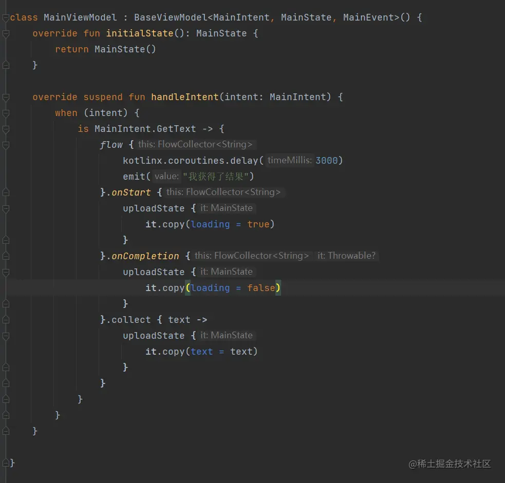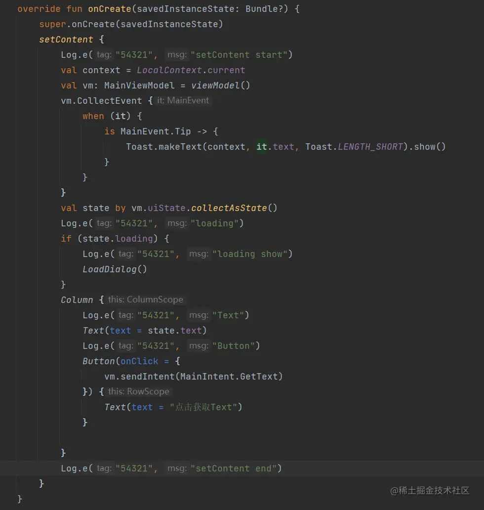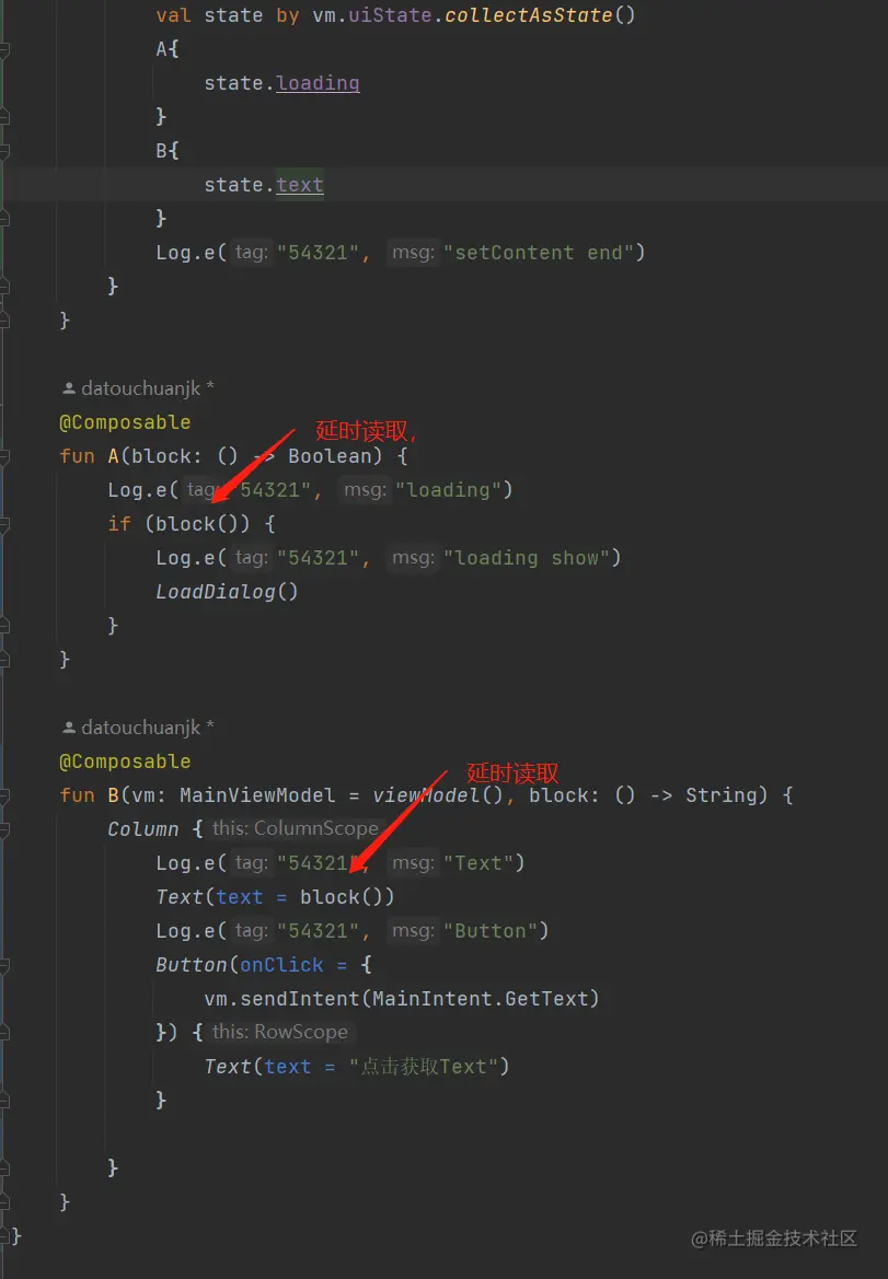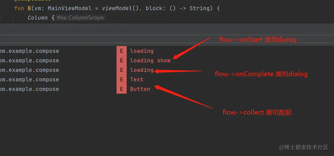 我的预期是这样,首先flow->onStart 会导致loading重组,然后 flow->onComplete 会导致loading 重组,在flow->collect 会导致 text重组,可是每次state的变更都会导致所有读取了state值的地方重组,这不是我需要的,于是我代码改成如下