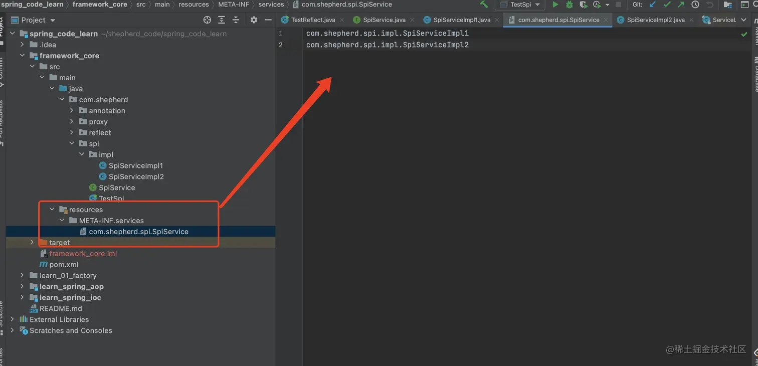 然后再定义两个接口实现类,这里为了方便就写在一个项目中,但是SPI的核心思想是引入相关框架之后,通过框架提供的spi机制,可以在自己的项目中提供spi接口实现类,动态扩展框架功能和做到可插拔,例如jdbc。