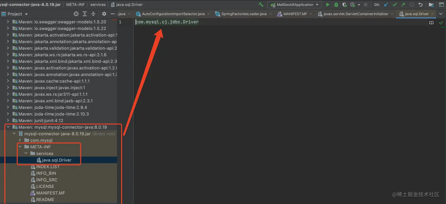 jdbc4.0以前, 开发人员还需要基于Class.forName("xxx")的方式来装载驱动,jdbc4以后基于spi的机制来发现驱动提供商了,可以通过META-INF/services/java.sql.Driver文件里指定实现类的方式来暴露驱动提供者。如下所示: