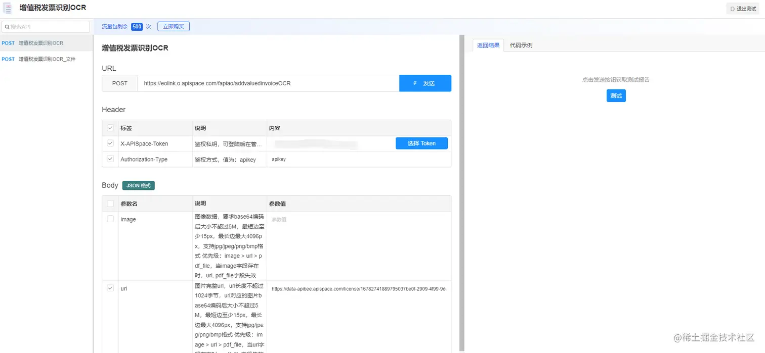 打开发票增值税OCR API 详情页,点击【免费试用】