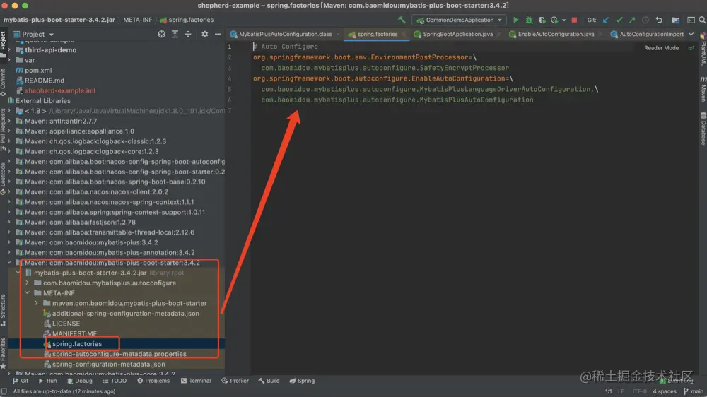 这里就是加载META-INF/spring.factories目录下的自动配置类,使用的是Java提供SPI(Service Provider Interface)扩展机制,不清楚该机制原理的可以看看之前总结的 SPI机制原理和使用,例如mybatis-plus的start的自动配置如下: