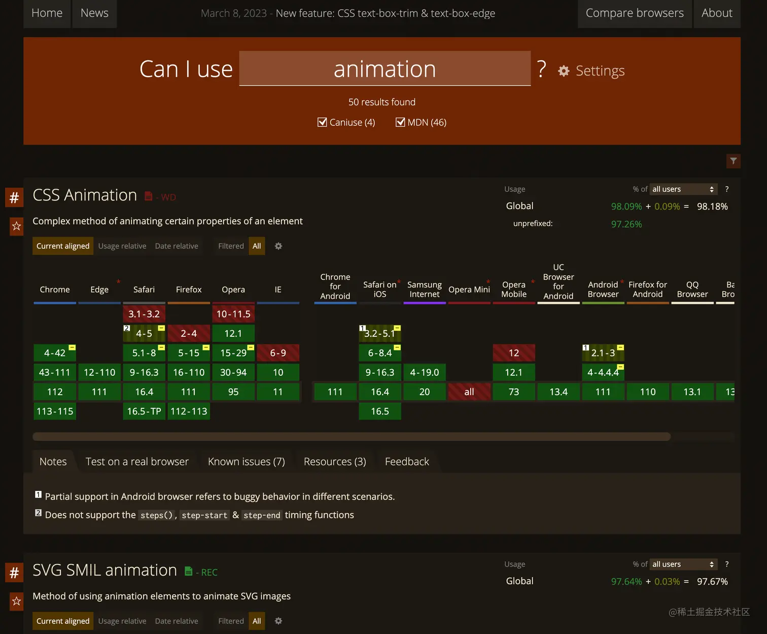 Can I Use是 提供了各种Web技术在不同浏览器和平台上的兼容性信息。Can I Use的界面简洁明了,支持多种Web技术,例如HTML、CSS、JavaScript、SVG、WebGL等。用户可以在搜索框中输入要查询的Web技术名称,然后选择相应的版本和浏览器,即可查看该技术在不同浏览器和平台上的兼容性信息。Can I Use还提供了一些高级功能,例如趋势图、全球使用情况、版本历史等,可以帮助用户更好地了解Web技术的发展和使用情况。