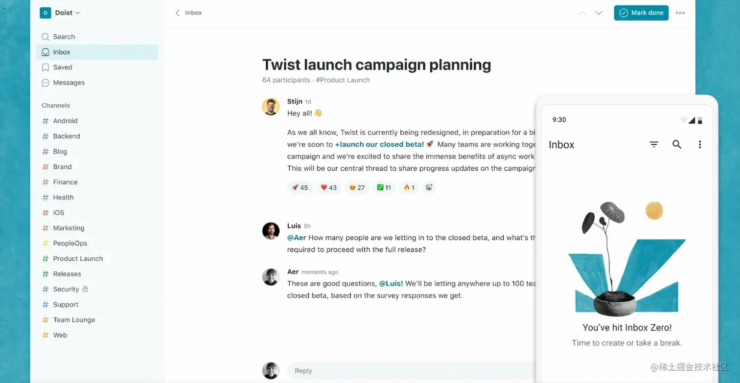 Twist是一个在线团队协作工具,可以帮助团队成员协同工作、分享信息和管理项目。Twist的界面简洁明了,支持多种协作功能,例如讨论、任务分配、文件共享、提醒等。Twist提供了多种集成功能,例如与GitHub、Trello、Google Drive等工具的集成,可以帮助团队成员更好地管理项目和任务。