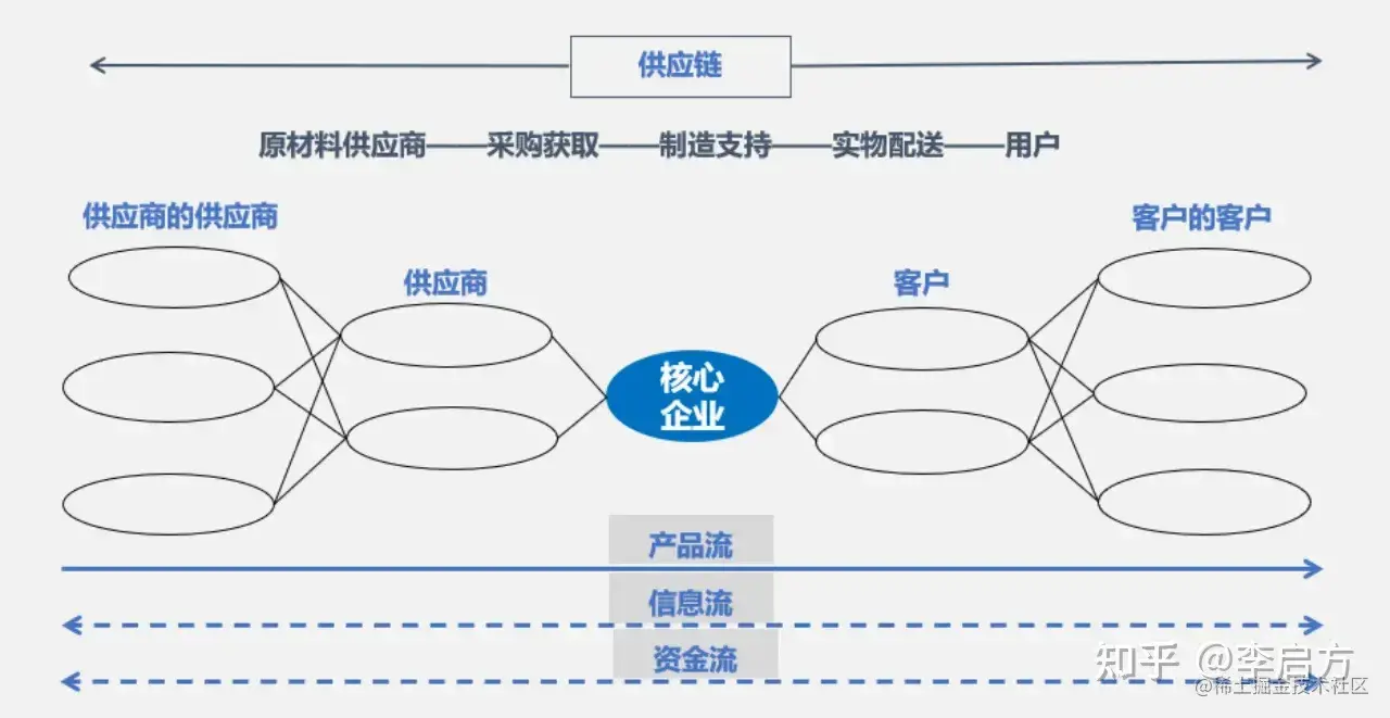 供应链的构成包括供应商、制造商、分销商零售商以及消费者五大部分,具体的供应链流程如下: