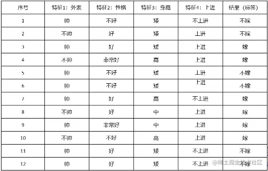 下表有12条训练数据,记录了女性的择偶标准,每条数据包含了4个特征。这4个特征对结果的体现程度是不一样的。如何度量这种不同? 用平均互信息