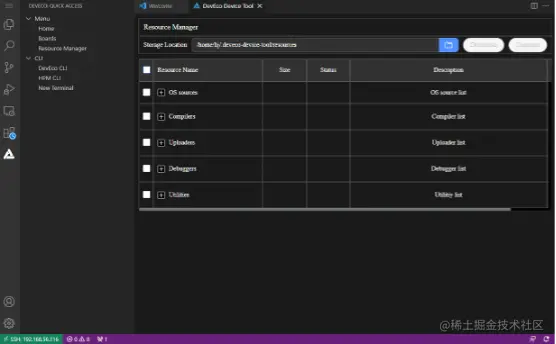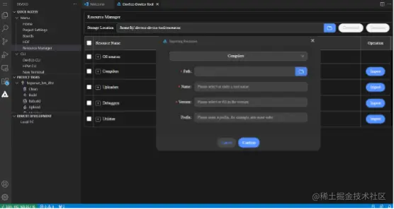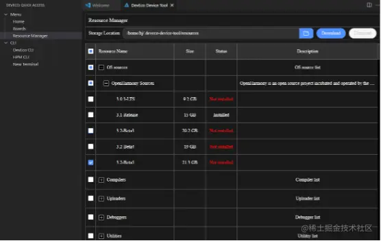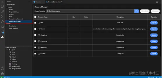 新版本Device Tool提供了独立的资源管理能力,源码、工具和芯片互相解耦,开发者可根据自身需求随意下载Device Tool已支持的源码、工具;也可通过导入按钮,导入Device Tool暂未支持的工具自由使用,极大的增强了Device Tool的灵活性。