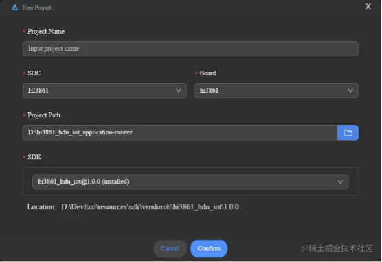 在Windows环境下,新建工程界面,选择对应的SDK时,若SDK已通过资源管理器下载完成,IDE会自动识别并列出SDK路径,用户点击确定即可完成创建工程。