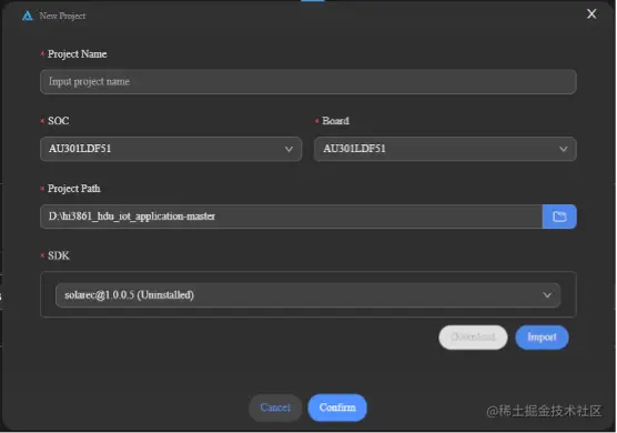 若没有通过资源管理器下载SDK,在选择完芯片开发板后SDK会自动匹配并提供下载/导入按钮。