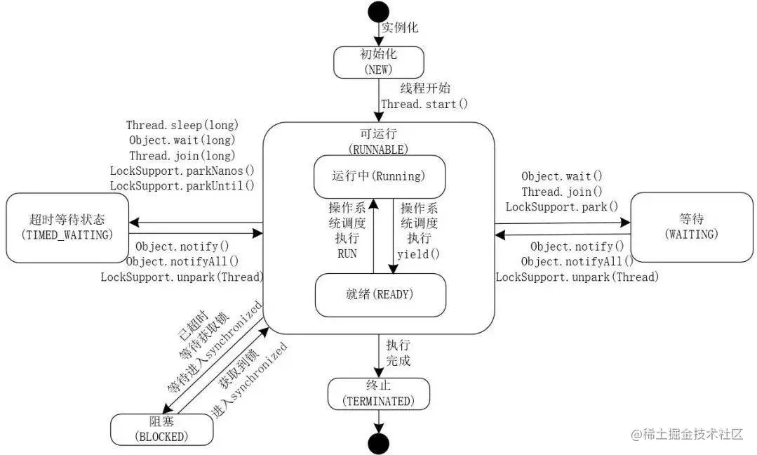 - NEW:初始状态,线程被构建,但是还没有调用start()方法。