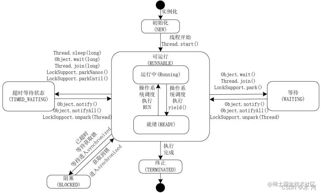 这里,有很多小伙伴不太明白为啥LockSupport.park();会导致thread01会永远阻塞。这里,冰河为你画了一张线程的生命周期图,如下所示。