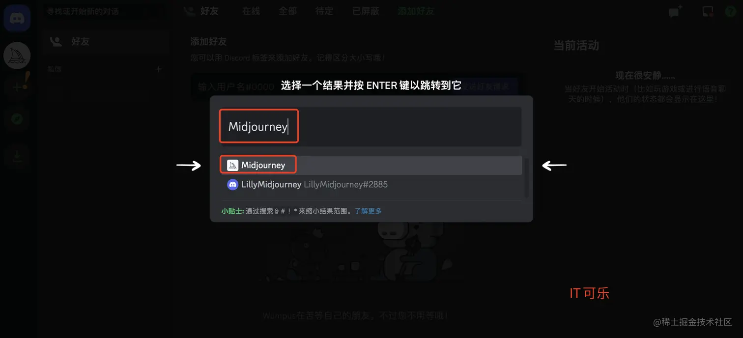 然后点击右上角的搜索框【寻找或开始新的对话】,搜索 Midjourney,加入频道即可,或者你可以直接点击右侧的小帆船图标直接进入。