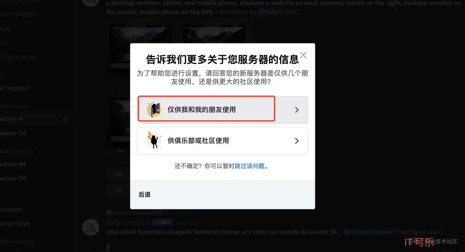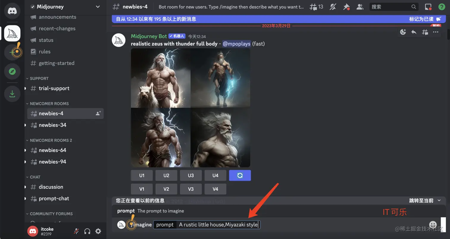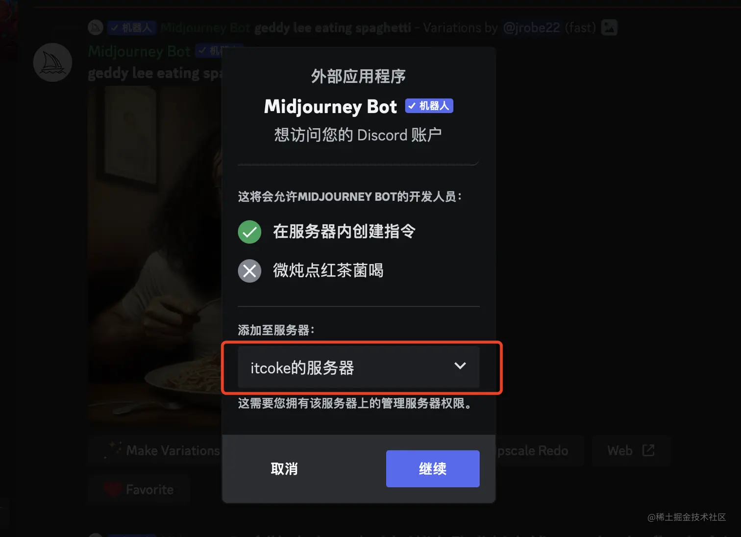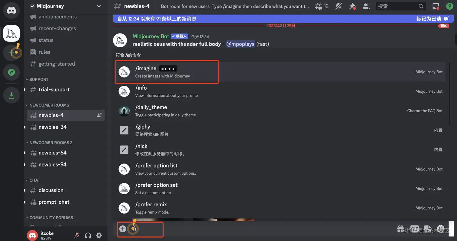然后再聊天框,打出一个 /i,选择出现的 imagine