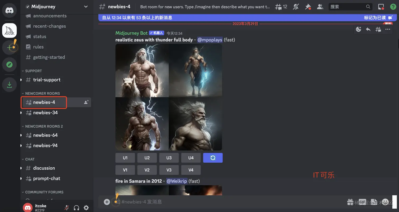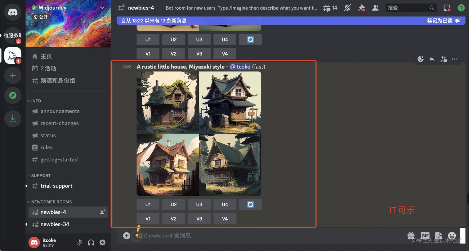 上一步我们是在公共频道出图,可能很快就被刷走了,需要点击搜索才能找到自己的图片,所以为了快速找到我们的图片,我们可以自己创建频道。