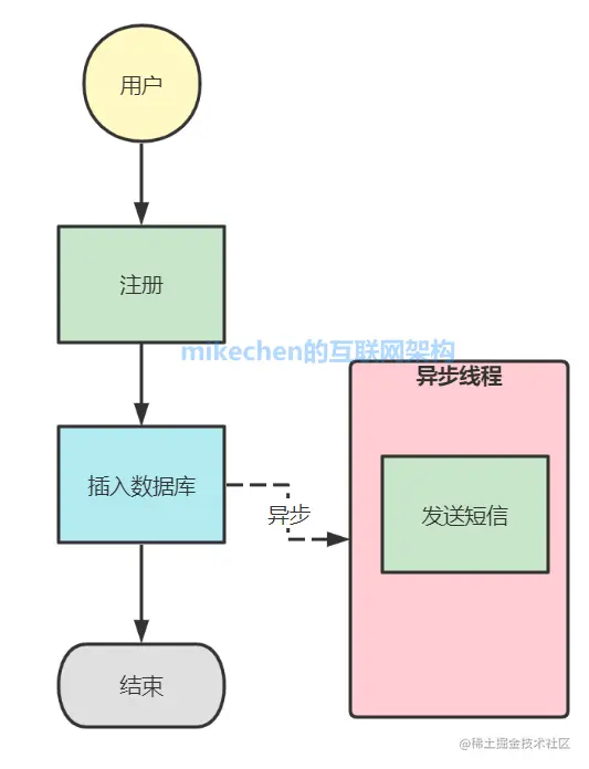 于是聪明的人们开始思考,如果两者关联性不强,能不能将一些非核心业务从主流程中剥离出来,于是有了异步编程雏形,改进后的流程如下: