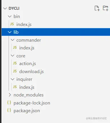 mycli文件夹(可自定义文件名),下方新建bin文件,bin文件新建index.js,这个index.js就是入口文件,index.js文件头部加入#!/usr/bin/env node代码 -