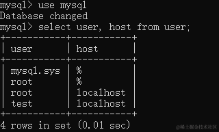 select user, host from user; //查询是否有 user=root ,host = % 的用户