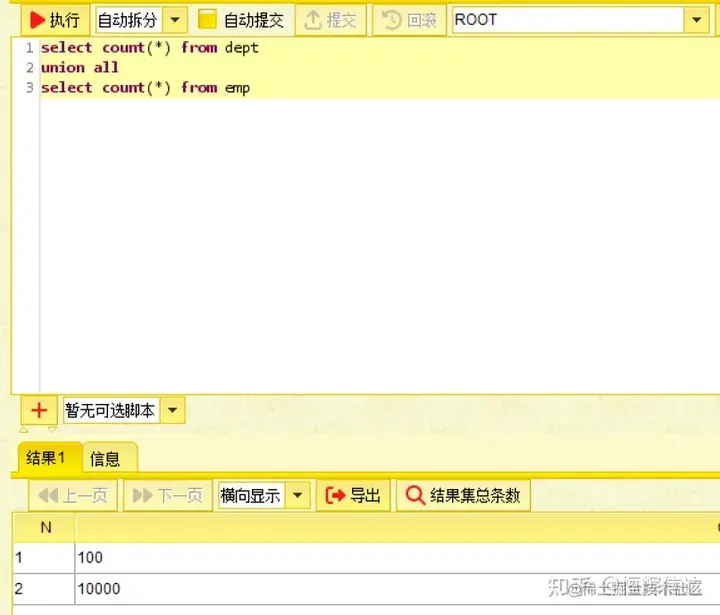 使用select count() from dept union all select count() from emp; 查看dept表和emp表共有多少条测试数据