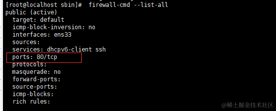 启动防火墙后,默认没有开启任何端口,需要手动开启端口。nginx默认是80端口