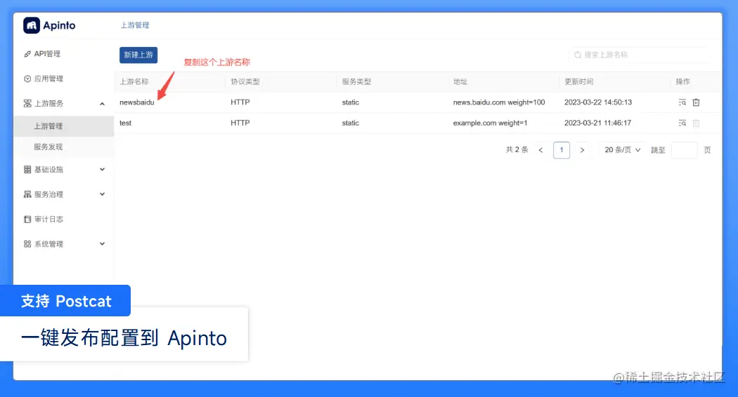 点击上游服务菜单,展开后再点击上游管理进入上游管理列表页面,若没有上游可新建一个,选中想要的上游名称,复制即可,如下图所示: