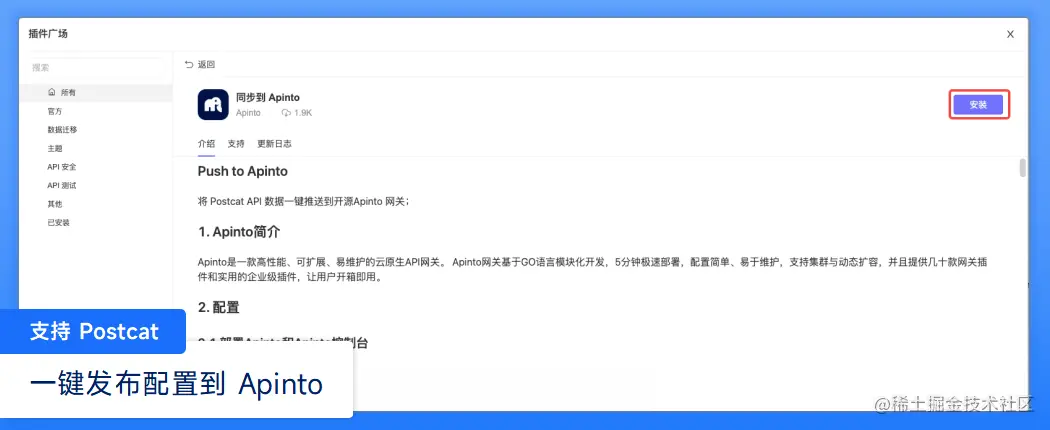 为了满足广大开发者在 Postcat 平台快速发布配置到 Apinto 网关上,我们与 Apinto 开源小组强强联手,合作推出的 「Apinto for Postcat」插件,目前已正式上架 Postcat 插件广场!