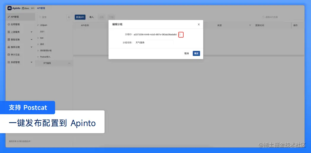 点击待导入接口的分组,复制分组的 分组ID;若分组不存在,则需要先新建分组。