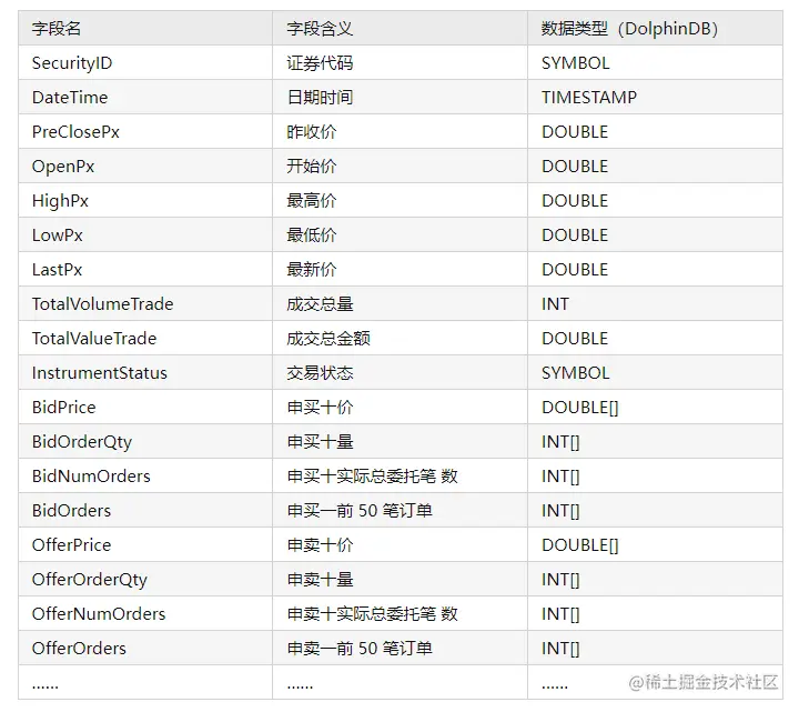 本教程选取了 2020.01.04 - 2021.01.08 全市场所有股票的 5 天的 level 2 快照数据。以下是快照表在DolphinDB的结构。BidOrderQty,BidPrice,BidNumOrders,BidOrders,OfferPrice,OfferOrderQty,OfferNumOrders 和 OfferOrders 8个字段分别包含多档数据,在 DolphinDB 中采用 ArrayVector 数据类型来保存: