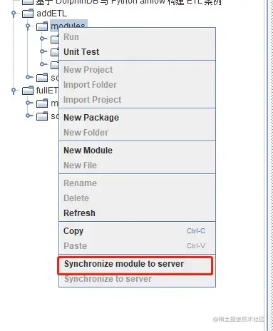 将 addETL 及 fullETL 项目中的 module 模块上传至 Airflow 中已建立连接的 DolphinDB server 中: