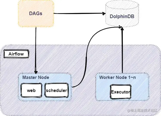 DolphinDB 作为一款高性能时序数据库,其在实际生产环境中常有数据的清洗、装换以及加载等需求,而对于该如何结构化管理好 ETL 作业,Airflow 提供了一种很好的思路。本篇教程为生产环境中 ETL 实践需求提供了一个解决方案,将 Python Airflow 引入到 DolphinDB 的高可用集群中,通过使用 Airflow 所提供的功能来实现更好管理 DolphinDB 数据 ETL 作业,整体架构如下: