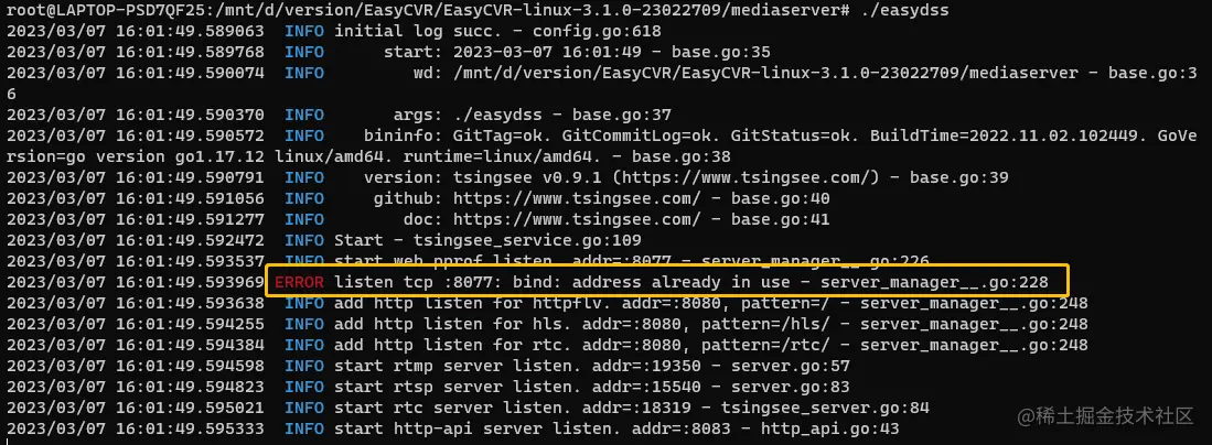 3)进入/mediaserver,启动easydss(流媒体进程)出现异常,报端口被占用;