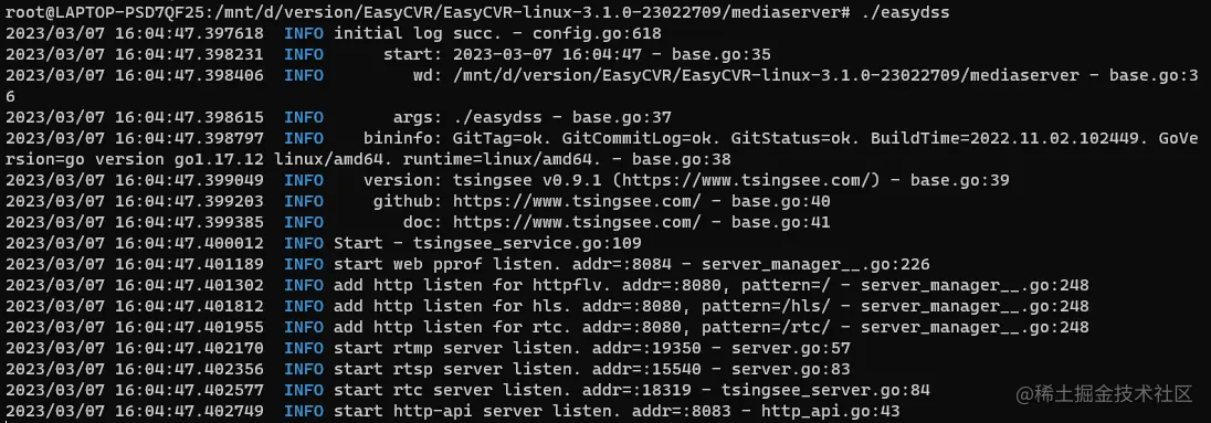 4)修改tsingsee.ini文件相应端口为可用端口后,再启动easydss进程,已经正常;