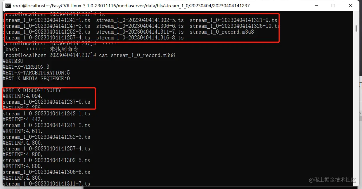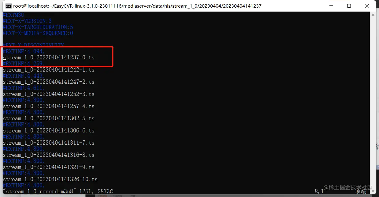 2)进入服务器,到内核的目录找到对应的ts文件。在用户的服务器下没有找到对应的ts文件,因为在开启录像前,m3u8文件为直播流,ts文件会随着新产生的ts文件被覆盖掉;