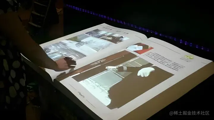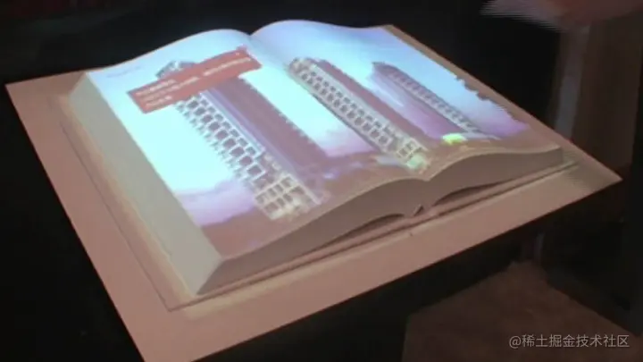 自投影融合技术出现后,投影技术实现了质的飞跃,在空中翻书的实现过程中,也可以通过投影的方式来进行展示,通过在书籍样式的白模上进行影像呈现,再将感应技术融入虚拟翻书系统中,用户便可以通过挥手的方式,实现翻页阅读。