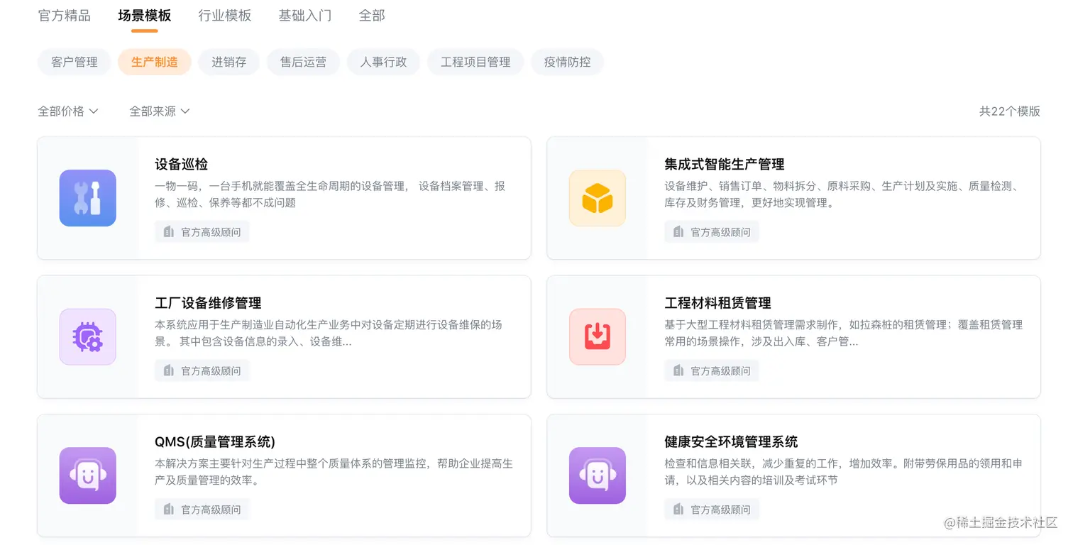 轻流的策略是以”轻商城“的方式提供细分场景的解决方案,其中设备巡检被纳入”生产制造“的分类下,和QMS、EHS等方案平级。
