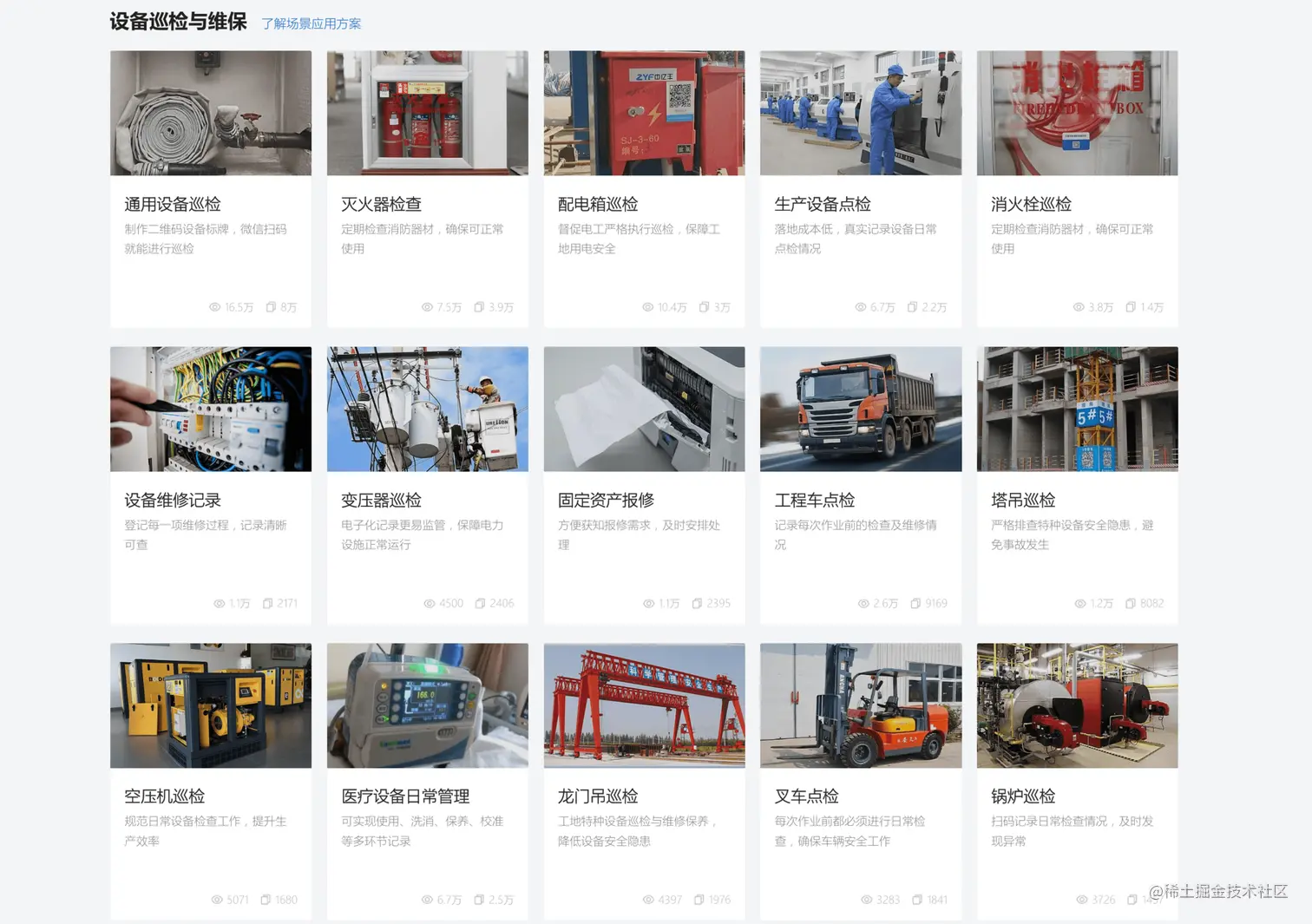 需要说明的是,轻流的设备巡检”模板“在功能上并不复杂,主要是扫码巡检、报修、保养的功能,满足的是通用的巡检场景,并未对生产设备、消防设备、电力设备等细分场景进行适配,可能需要有一定的二次开发能力。