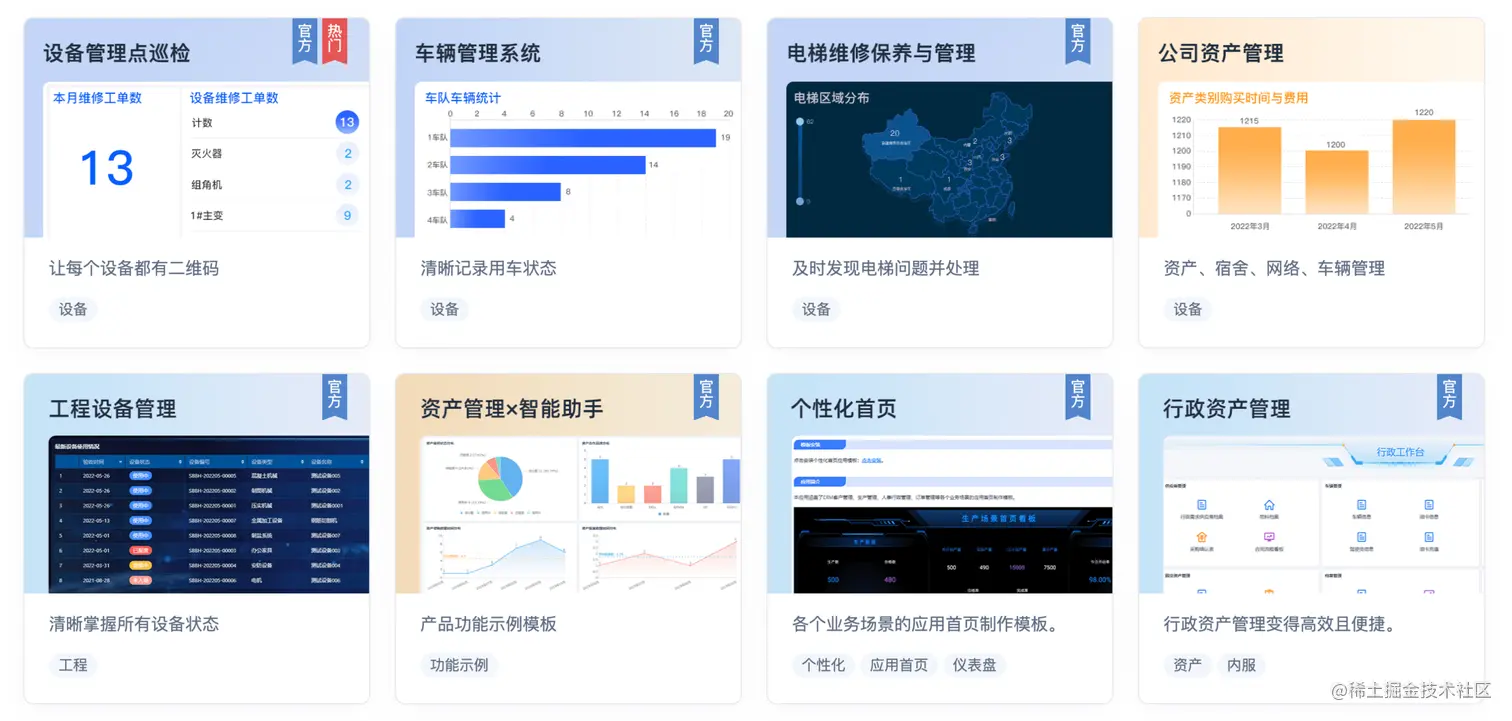 简道云也有类似”模板库“的页面,将资产和设备合并成了一个分类,汇总了设备管理点巡检、电梯维修保养与管理、工程设备管理三个巡检相关的模板。