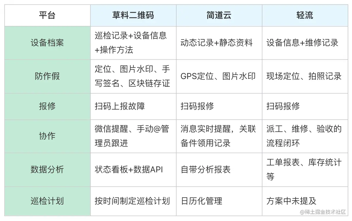 综合评价:草料二维码提供的是轻量化的二维码巡检,巡检相关的功能比较完善,提供了简单的状态看板,可以在小程序上直观看到设备状态,但需要利用第三方BI工具制作报表;简道云和轻流的功能比较相似,在设备档案、防作假方面不如草料二维码成熟,但协作和数据分析功能更加完善。