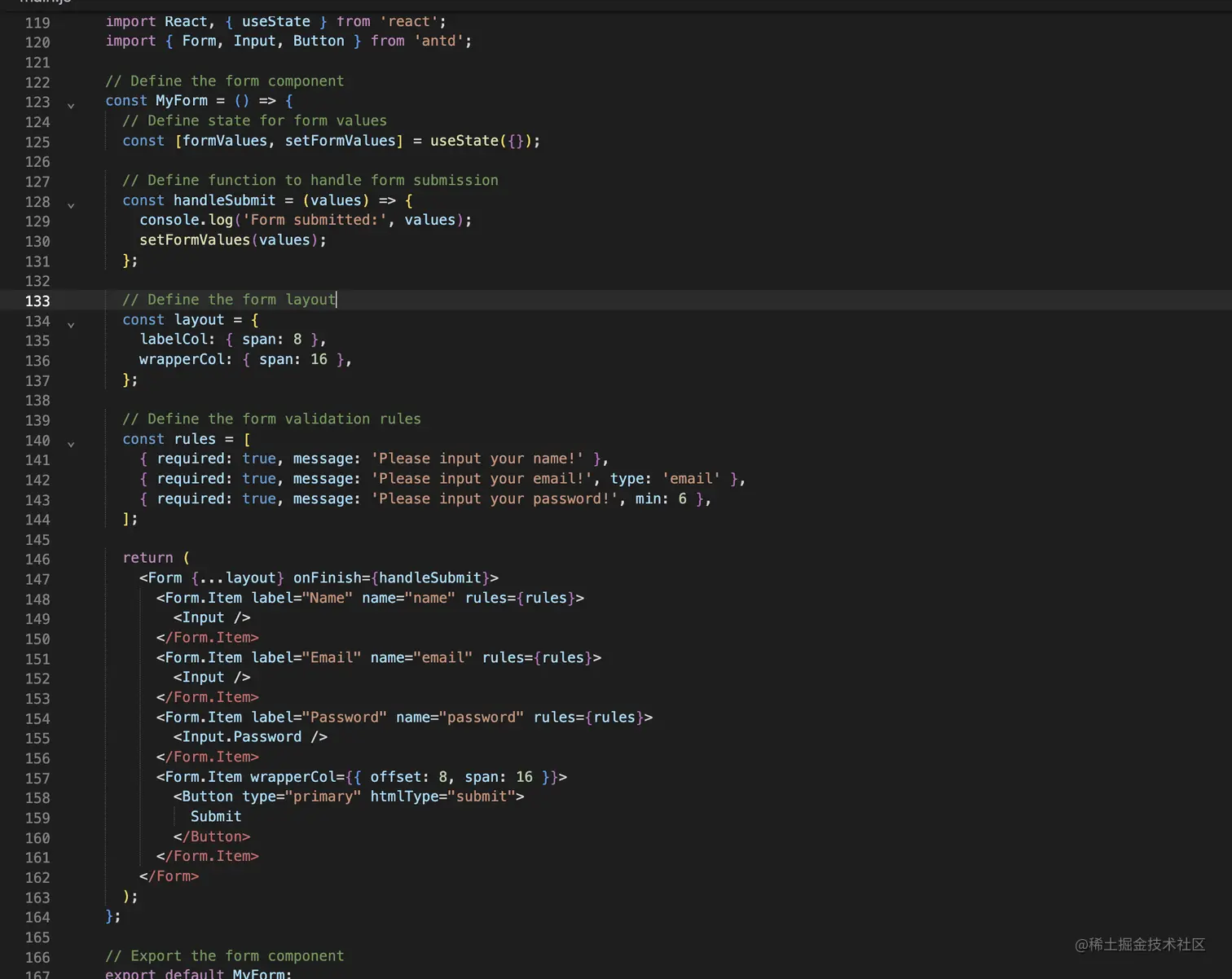 输入:请用react hooks antd写一个表单模版