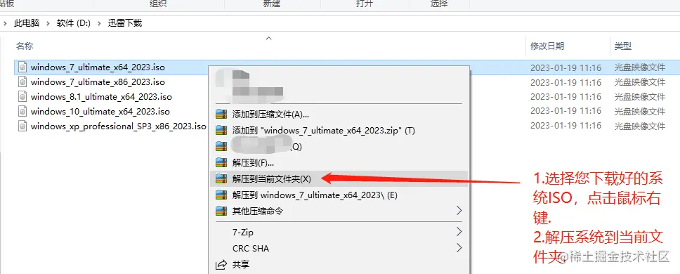 一、使用压缩软件→**右键解压已下载的ISO文件到非系统盘(如下图:D\迅雷下载)外的其他盘符目录下;