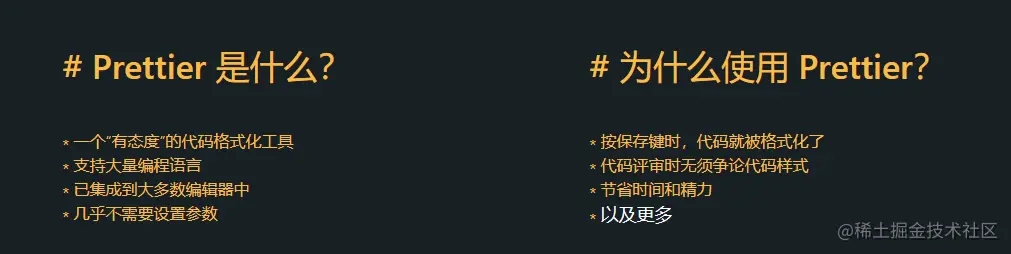 而 Prettier 是一个支持很多语言的代码格式化工具, 对应的是各种 Linters 的 Formatting rules 这一类规则。而且你用了 Prettier 之后,就不会再违反这类规则了!不需要你自己手动修改代码。