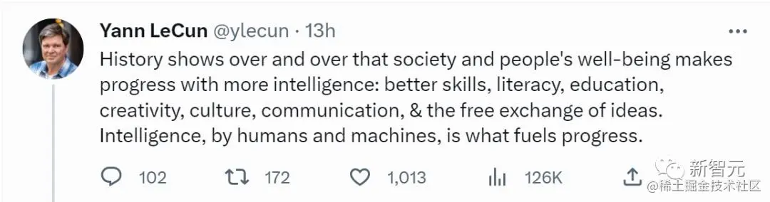 今日,LeCun 发推再次强调自己的立场:人类需要机器智能。