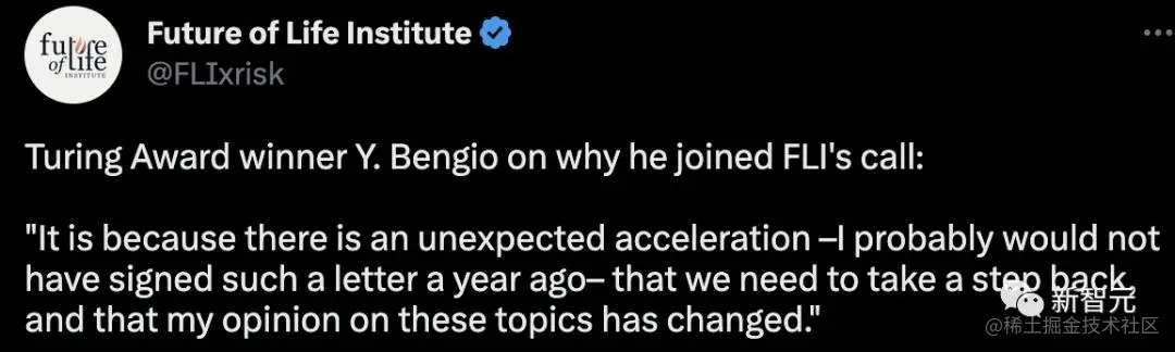 另外,签署公开信的图灵三巨头之一 Yoshua Bengio 在沉默几天后,首次解释了自己加入 FLI 呼吁的看法: