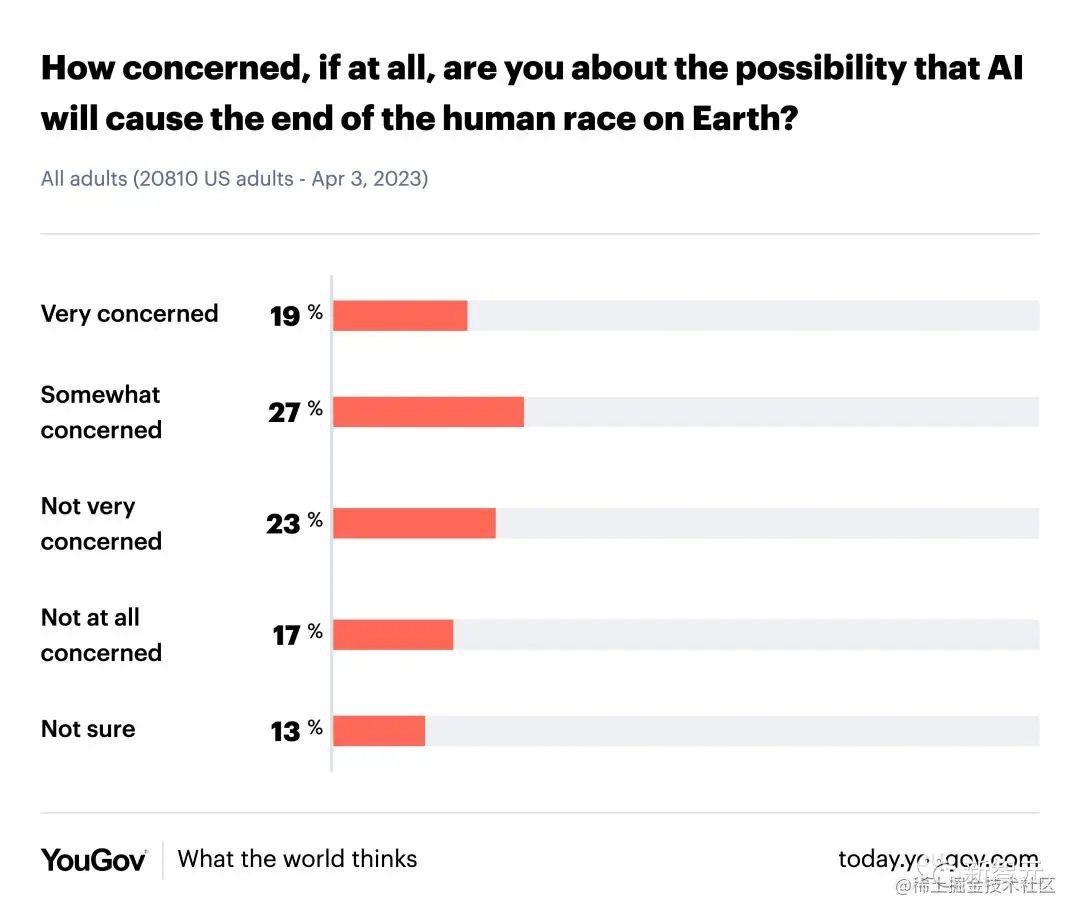 而关心 AI 会毁灭人类这个话题的人,和不关心的人,大约各占一半。