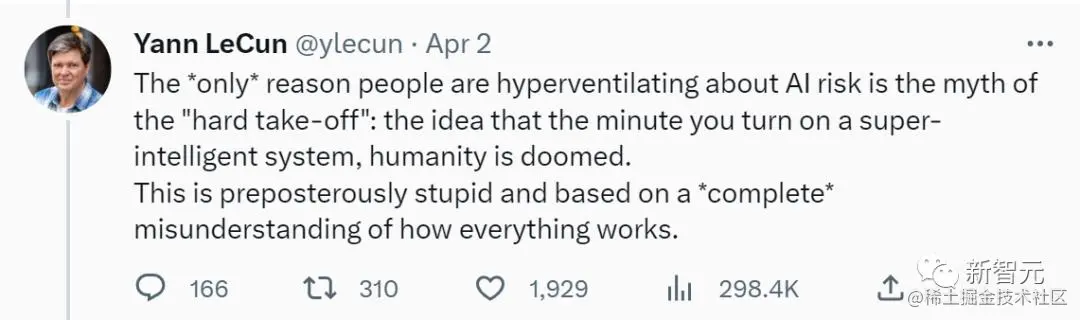 「人们对 AI 风险过度担忧的唯一原因,就是这个神话:当你打开一个超级智能系统的那一刻,人类就注定要灭亡。这是荒谬的愚蠢,基于对 AI 运作方式彻底的误解。」