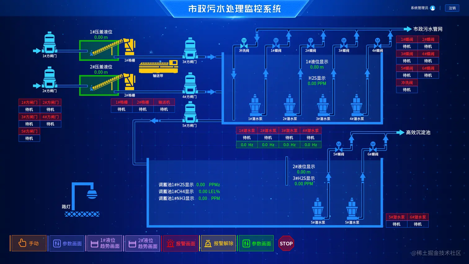 数字孪生智慧污水厂三维可视化系统依托数维图科技自主研发的可视化编辑器Sovit3D开发设计,无缝融合 2D、3D 技术,通过拖拉拽的编辑方式,建立了一个包含天空、环境、建筑、设备、沉淀池、曝气池、生物滤池、生物转盘、后沉淀池、污水泵、污泥泵、计量泵、螺杆泵、空气压缩机、罗茨鼓风机、离心鼓风机、电动葫芦、桥式起重机等的三维场景。实现厂区人、机、水、场及环境等各要素的全面感知,辅助管理者全面掌控厂区运行态势。