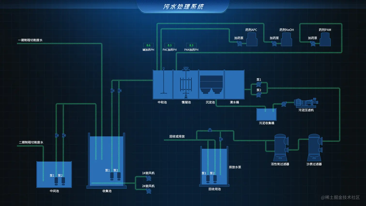 针对污水厂各类管线布局,采用三维组态仿真技术,1:1 呈现污水处理厂管道分布的 3D模型。对污水处理管道实时感知、在线监测。系统将管网按类型选用不同颜色标识,与实际物理场景一一对应,清晰的标注出污水处理的各种管线流向,有污水管线、污泥管线、空气管线、加药管线等。帮助工作人员熟悉和认知厂内管线,提升污水厂管理水平。