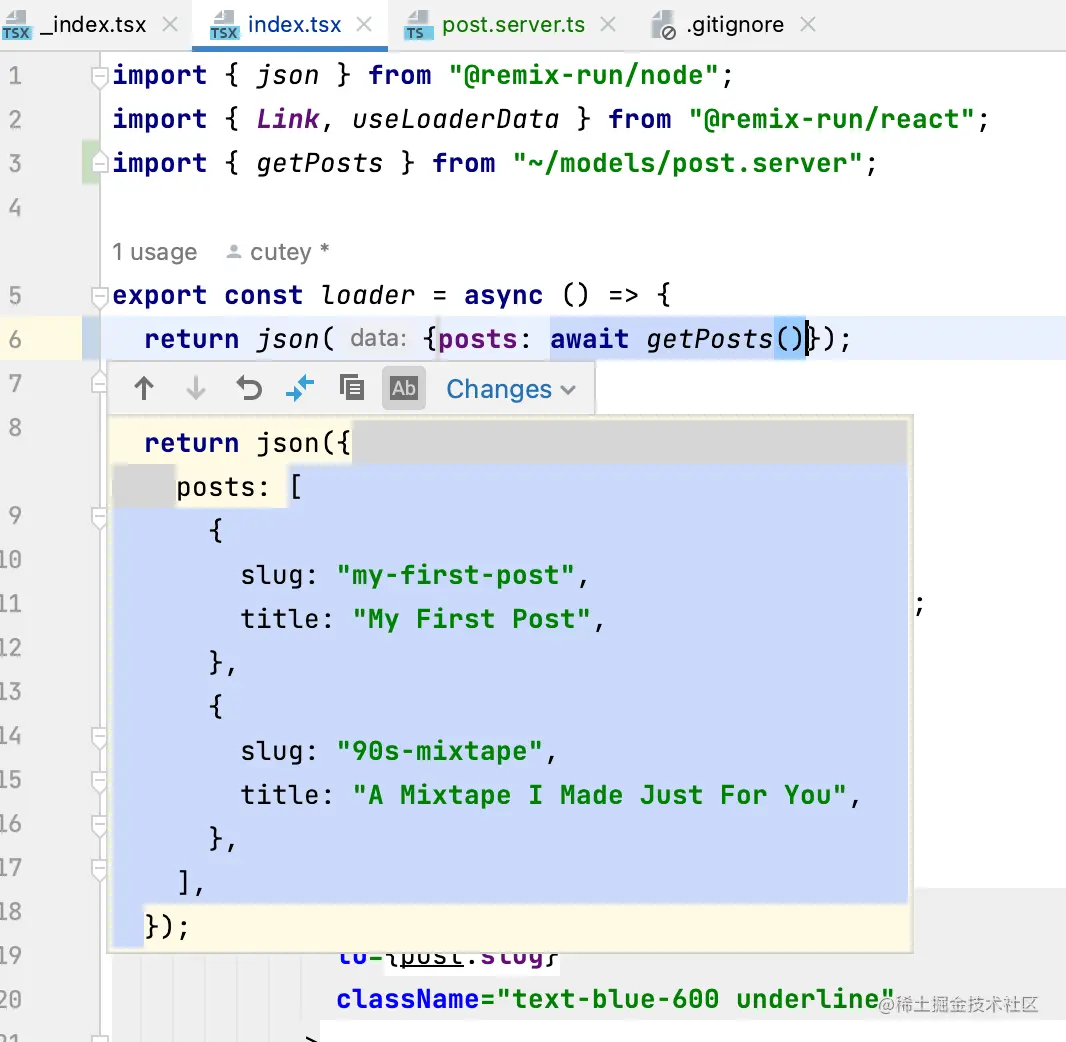 再来改造下posts路由的index主界面,这样就能够从remix的后台中取数据了。