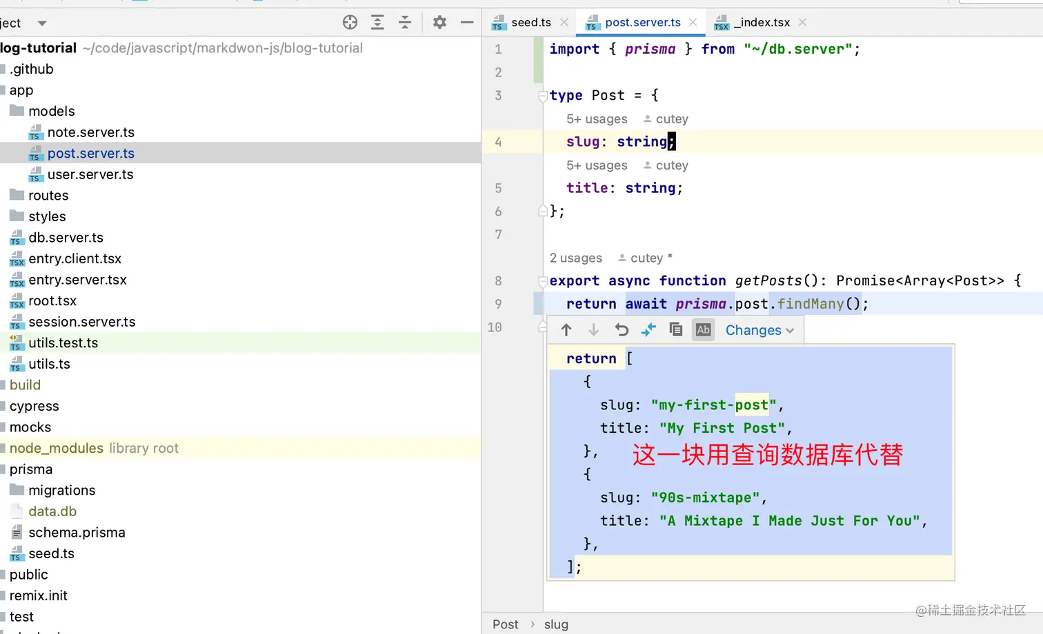 一般来说读数据和写数据都是后台的工作,前台只是调用接口或者调用方法去获取数据。还记得吗,前面介绍remix的时候就说过是这个全栈式框架,所以解析来吧博客数据放到后台中。