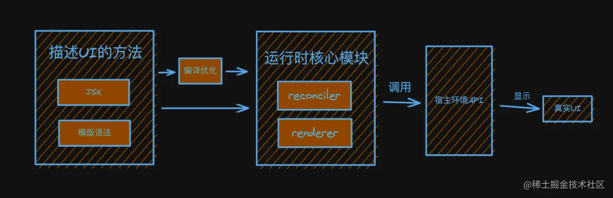 对于react来说,消费的是jsx,并且没有编译优化,而其他框架有编译优化,也就是说react是一个纯运行时的前端框架,我们的核心模块可以开放通用的API供不同的宿主环境使用,这也就是跨端的方式,比如React Native,React AR,React
