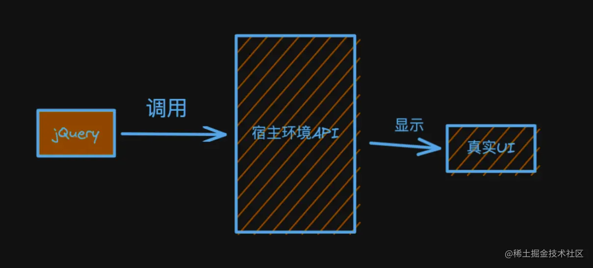 在前端框架出现之前,我们熟知的jQuery是过程驱动的,也就是开发者去调用宿主环境的API,然后更新到真实的UI