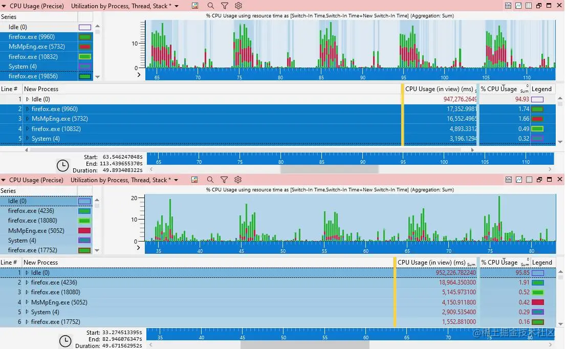 在长期排除后,Mozilla 团队将问题缩小到 Windows 系统的 Msmpeng.exe(Microsoft 恶意软件保护引擎),在运行 FireFox 时,该进程会访问 sechost.dll 以运行 ProcessTrace,也就是处理来自其他进程的 Windows 事件跟踪,而且运行 FireFox 时生成的事件比正常情况多得多。这导致与 Chrome 等其他浏览器相比,Firefox 消耗的 CPU 资源高了 5 倍。